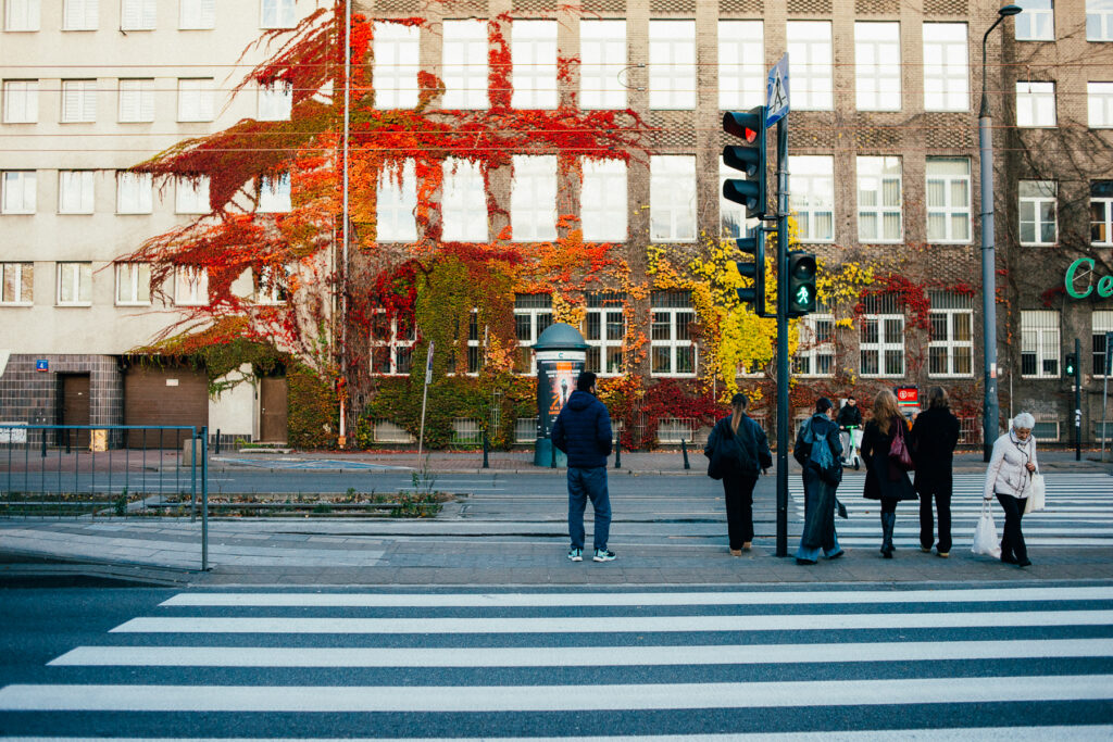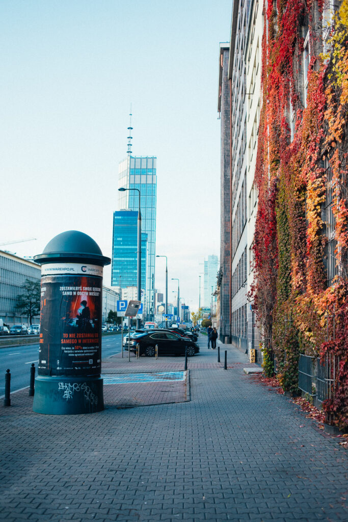 Po jedzeniu spacer do hotelu. Lubię tę część Warszawy (kiedyś nigdy nie powiedziałbym, że polubię Warszawę, a jednak… :)) . To jak współczesna architektura miesza się ze starym budownictwem. Przestrzeń, ruch, przebarwiające się pnącza. Cóż, zrobiło mi się naprawdę dobrze 🙂